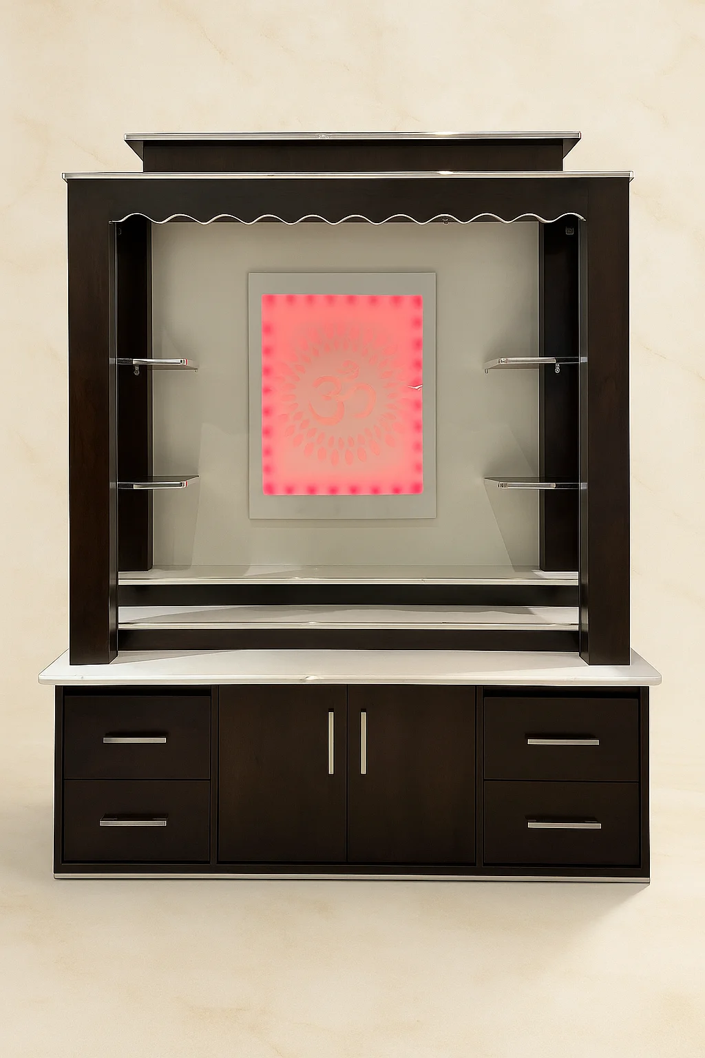 The MC 103 Temple features a modern, dark wood design with a sleek white countertop and subtle LED lighting behind the OM symbol, creating a serene and inviting ambiance. Its spacious structure provides ample display space and storage, making it ideal for home worship.