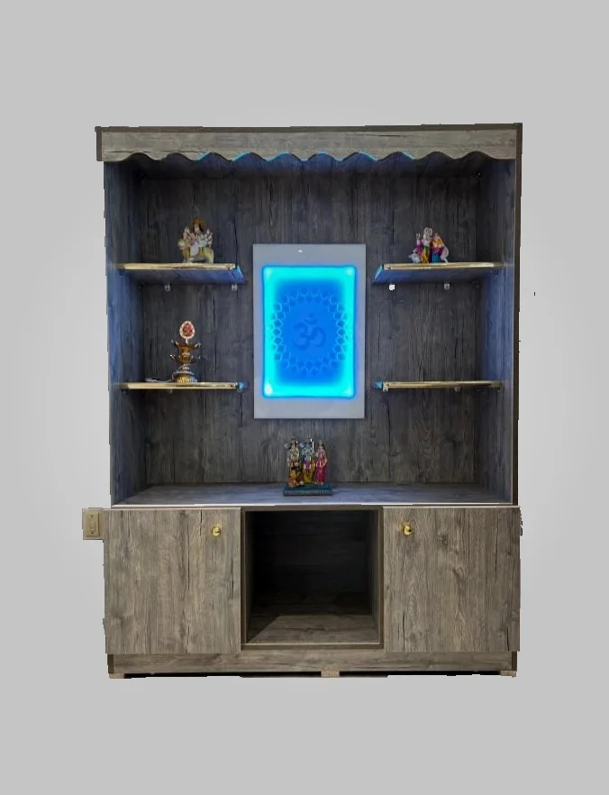 The MC 111 Temple features a rustic wood finish with modern LED backlighting behind the OM symbol, creating a serene and contemporary spiritual space. Designed with multiple shelves and storage cabinets, it offers functionality, durability and a well-organized setup for home worship.