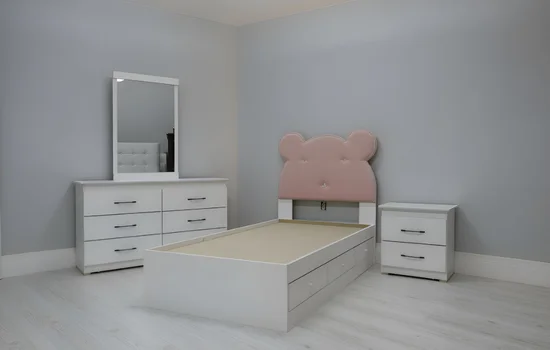 The Mickey Bedroom Set features a clean white finish paired with a playful pink upholstered headboard, creating a fun and cheerful bedroom atmosphere for kids. Designed with both style and functionality in mind, this set includes a storage bed, a spacious dresser with mirror and a convenient nightstand. The built-in drawers provide ample storage space to keep toys, clothes and essentials organized and clutter-free. Its smooth finish and soft colour combination enhance the overall appeal of the room. Built with durable materials, this bedroom set offers long-lasting use, comfort and a lively, child-friendly design.