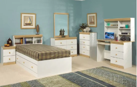 The NB-75K Bedroom Set features a soft white finish complemented by warm wood accents, creating a bright, clean and inviting bedroom atmosphere. Designed for both style and functionality, this complete set includes a storage bed, a dresser with mirror, a tall chest, a convenient nightstand and a practical study desk. The built-in drawers provide ample storage to keep your essentials organized and easily accessible. Its smooth finish and simple design enhance the overall aesthetic, while durable construction ensures long-lasting use. Ideal for modern homes, this set offers comfort, organization and a timeless, space-saving solution.
